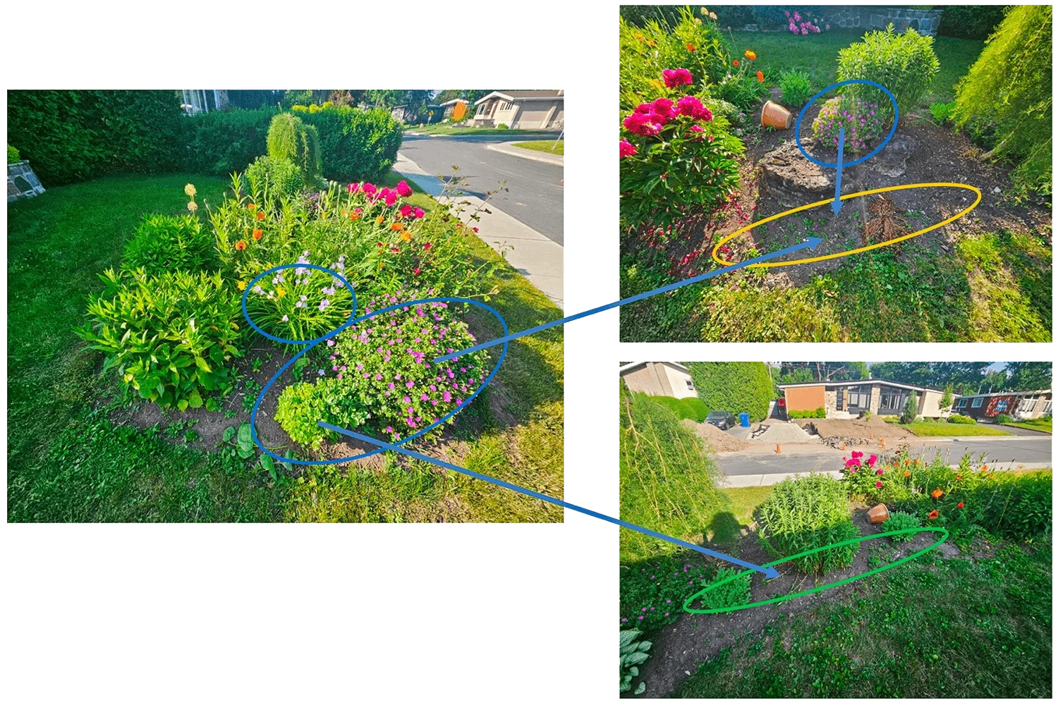 Les images ci-contre présentent un croquis d’une nouvelle plate-bande et des photos de relocalisations de végétaux existants.