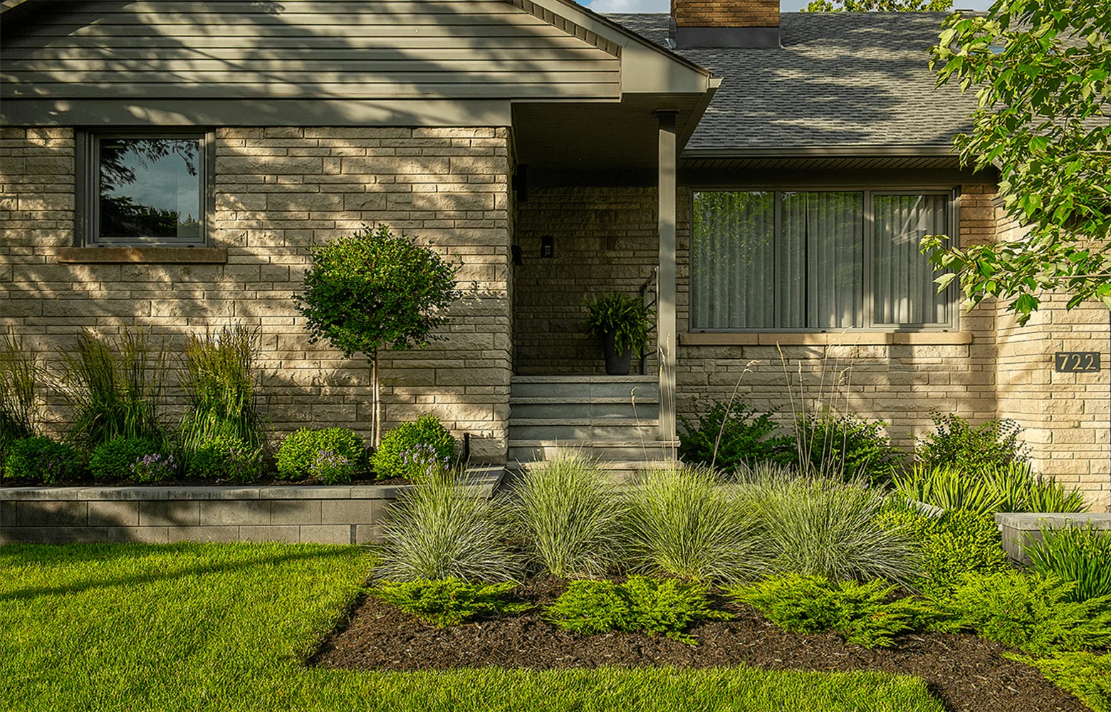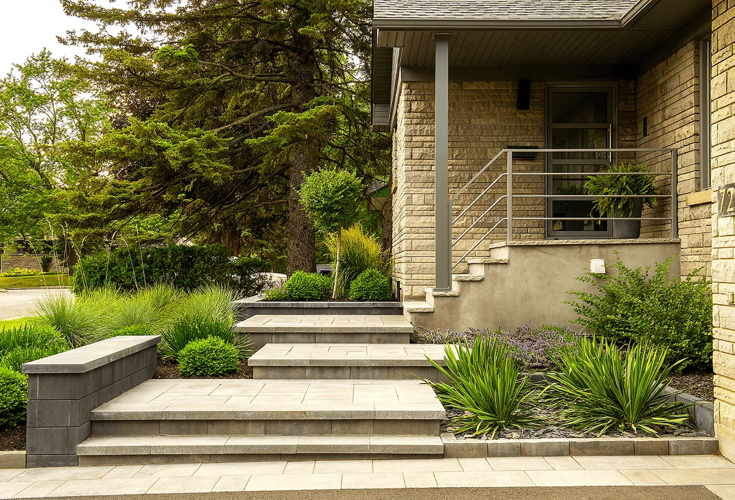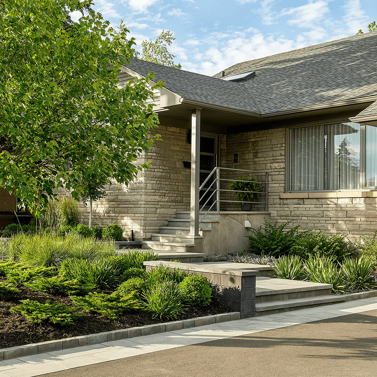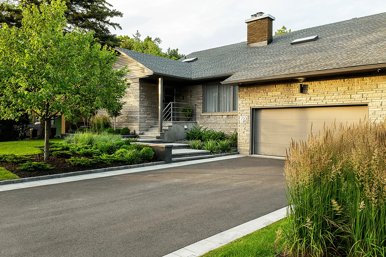 Grâce à une reconfiguration stratégique du terrain, les écoulements d’eau ont été redirigés efficacement vers des puits secs, protégeant ainsi la fondation de la résidence tout en maximisant l’esthétisme. Une nouvelle entrée, embellie par des matériaux modernes et intemporels, crée une façade accueillante et revitalisée, en parfaite harmonie avec l’architecture de la maison. Cet aménagement allie ingénieusement fonctionnalité et design, transformant une contrainte en une opportunité de valoriser l’ensemble de la propriété.
