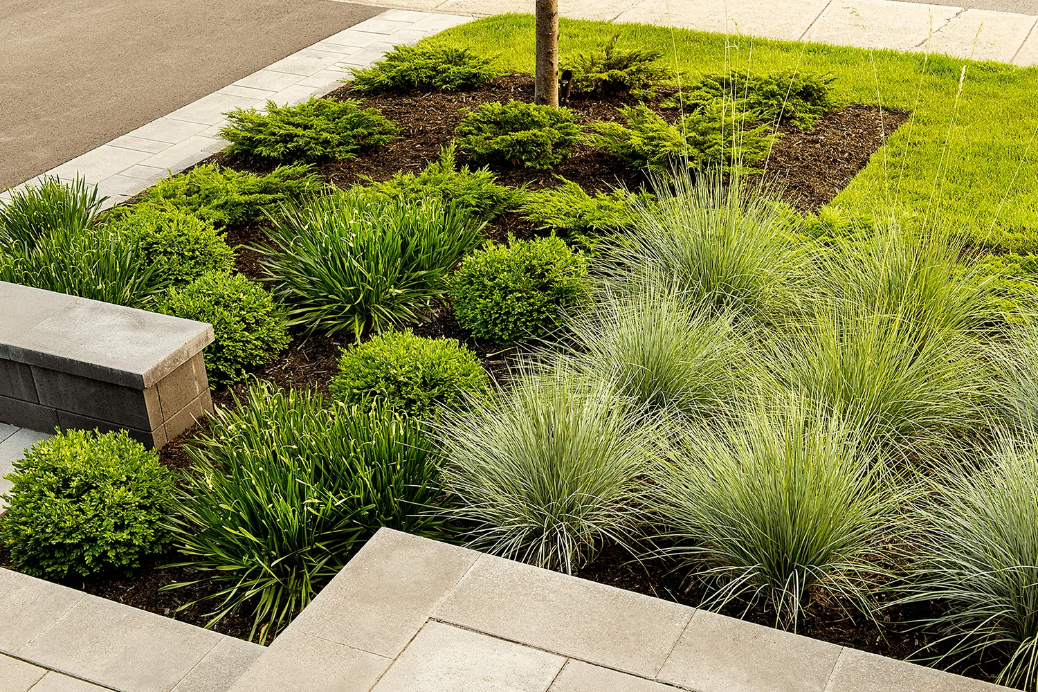 La proposition se distingue par sa simplicité et ses contrastes de textures : feuillages variés, béton lisse et métal mat. Les formes sphériques des végétaux contrastent avec les lignes droites de la composition. Cet aménagement épuré évolue avec les saisons, alliant géométrie et harmonie.