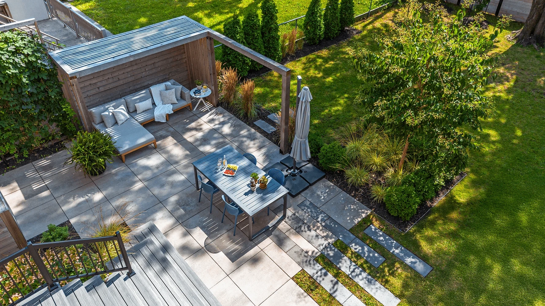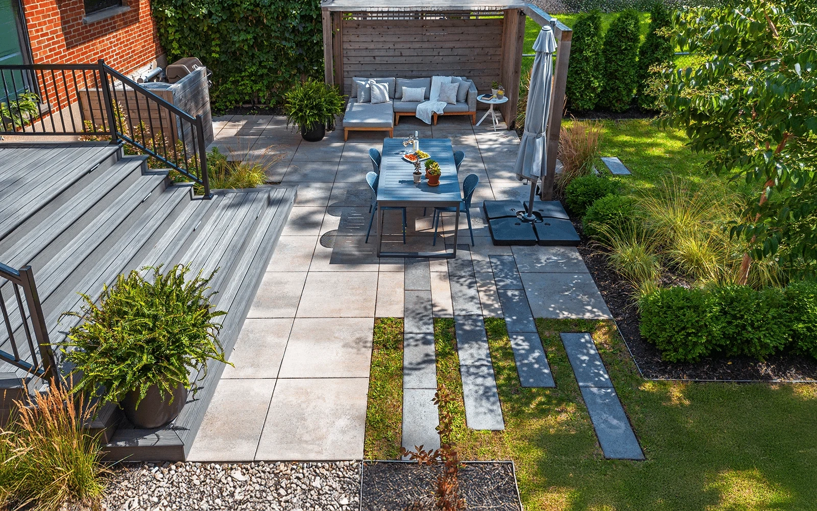 La pergola, en bois de cèdre, a été conçue pour s’intégrer parfaitement dans l’environnement. Avec le temps, elle prendra une patine grisonnante, ajoutant du caractère tout en se fondant subtilement dans le décor. Ce choix s’harmonise parfaitement avec les pavés choisis avec soin par l’architecte, qui ont été sélectionnés non seulement pour leur esthétique, mais aussi pour leur robustesse et leur capacité à créer une atmosphère chaleureuse et naturelle.