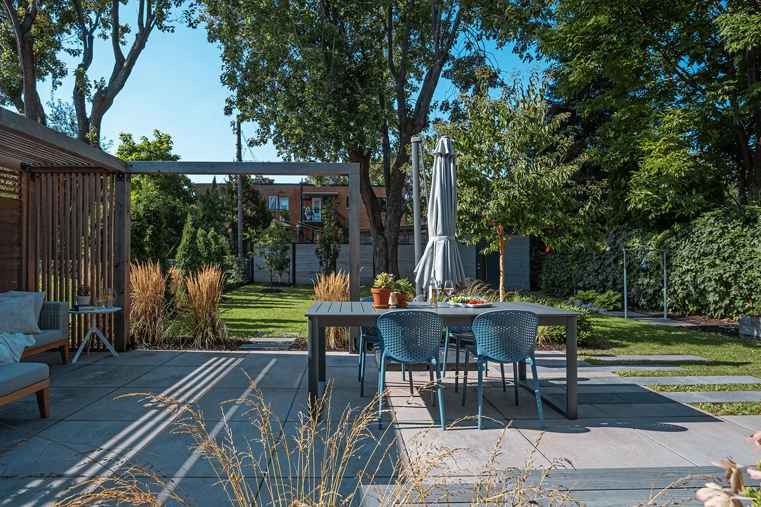 Au cœur de cet espace, un arbre a été soigneusement planté pour, avec le temps, développer une canopée qui viendra surplomber le coin repas. Cette plantation stratégique permettra, à long terme, d'apporter une ombre naturelle, idéale pour profiter des repas en extérieur, tout en créant un effet de refuge végétal.