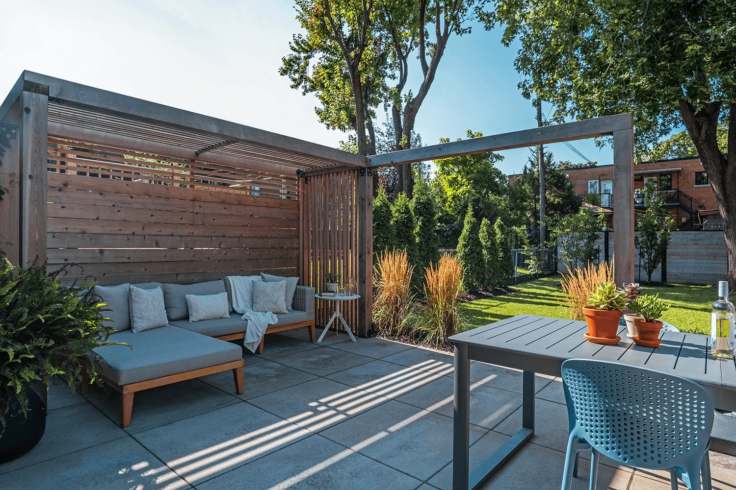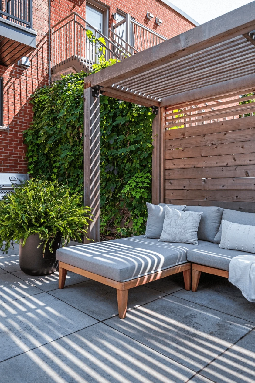 Dans ce projet de duplex sur deux étages, le principal défi était de préserver l’intimité des résidents face à un balcon vis-à-vis offrant une vue directe sur le logement voisin. Pour répondre à cette problématique, nous avons imaginé des solutions sur mesure, combinant végétation et aménagement paysager pour offrir un cocon privé tout en intégrant harmonieusement les espaces extérieurs.