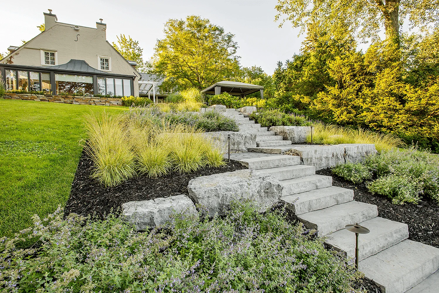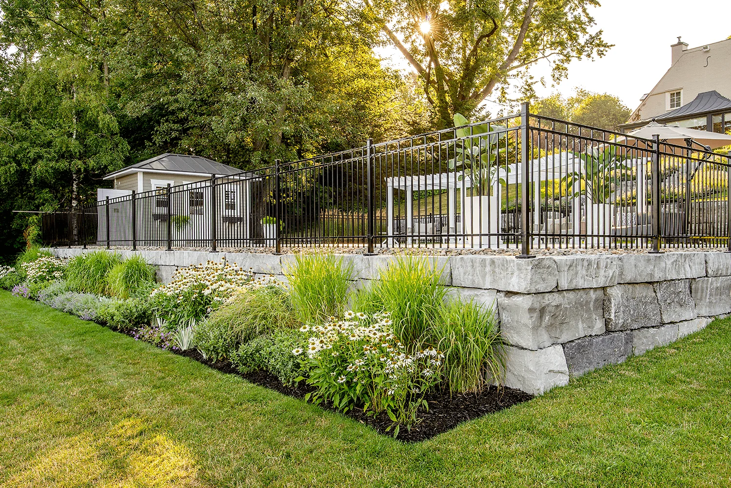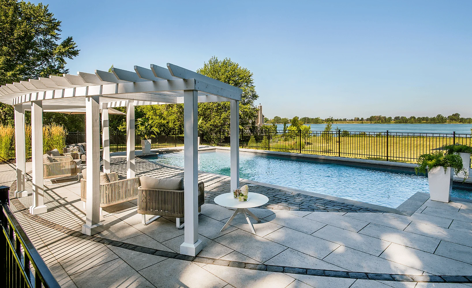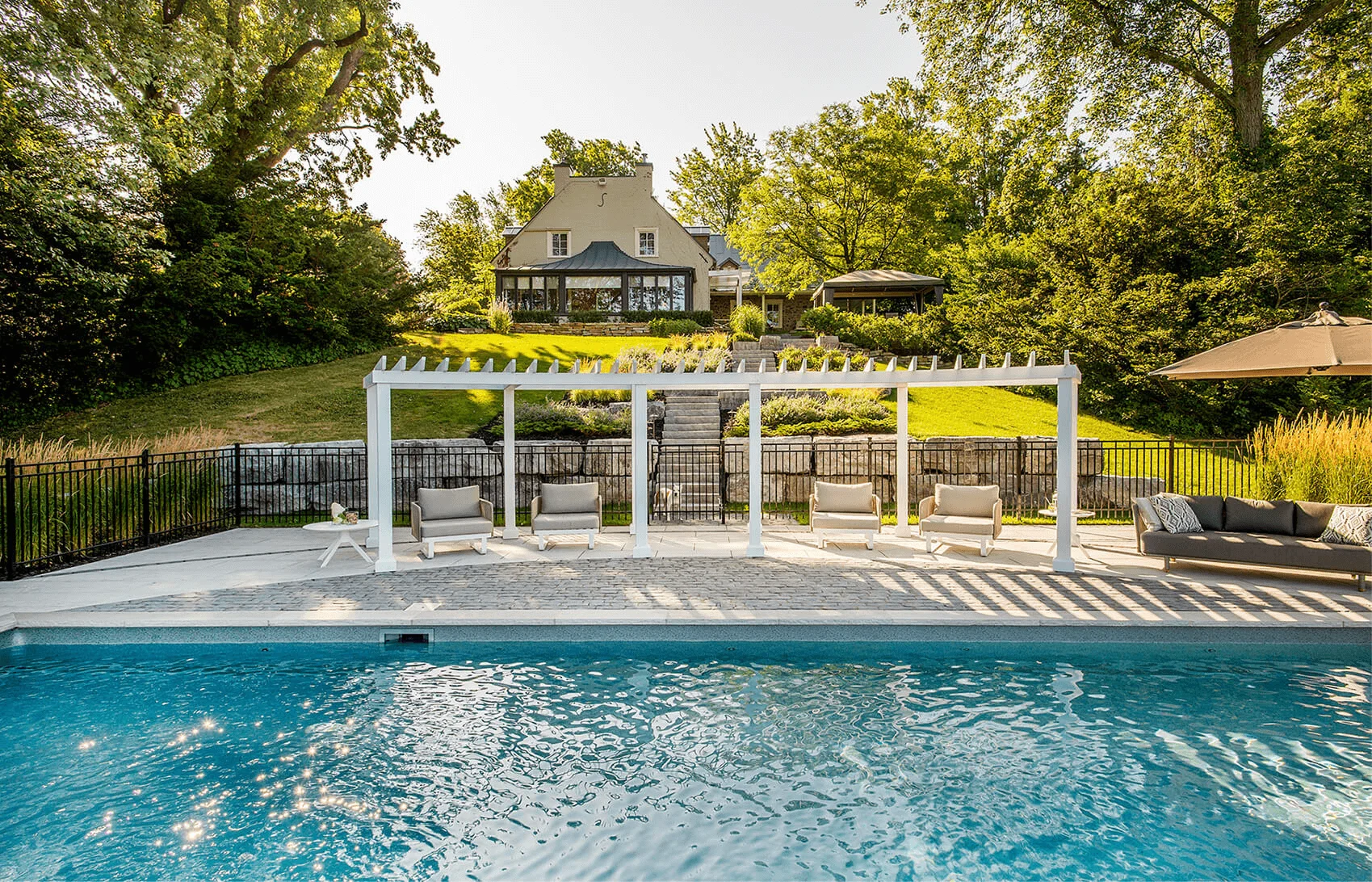 Le propriétaire exprimait le désir d’aménager son terrain tout en conservant la vue sur le fleuve. Dans cette perspective, nous sommes intervenus dans la pente naturelle du terrain en repensant la terrasse avec un pavillon, une volée de marches et des enrochements menant à la piscine. Cette dernière a été intégrée de manière harmonieuse au projet, accueillant une pergola semi-circulaire sur mesure. Des plantations champêtres ont été soigneusement disposées pour compléter l’esthétique de la résidence patrimoniale, créant ainsi un ensemble cohérent et accueillant.
