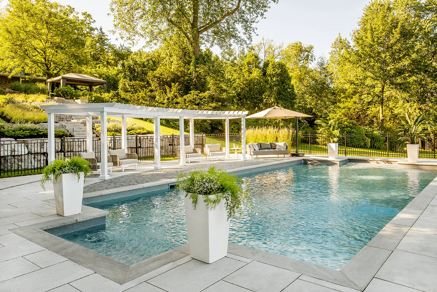 Situé stratégiquement, le projet offre un accès pratique via une rue adjacente. Au pied du talus, une piscine auto-portante avec une section centrale profonde, soutenue par des pierres naturelles guillotinées, a été proposée. La modération de la pente abrupte a permis la création d’une zone de transition, incorporant boulders et des marches monolithiques en pierres naturelles entre la résidence et la nouvelle piscine. La pergola sur mesure, de forme arrondie, témoigne du talent exceptionnel de nos menuisiers.